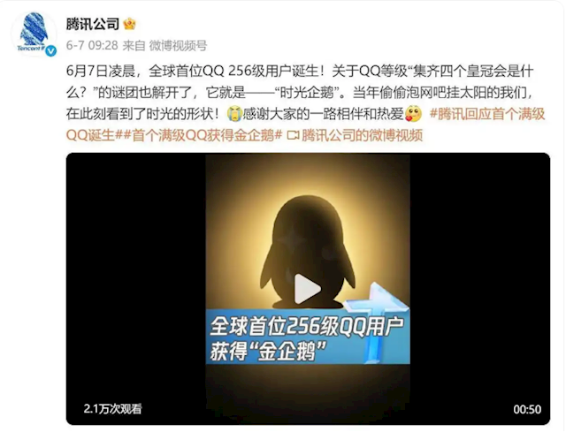 全球第二个“满级QQ”诞生:已显示金企鹅 系首个“满级QQ”小号